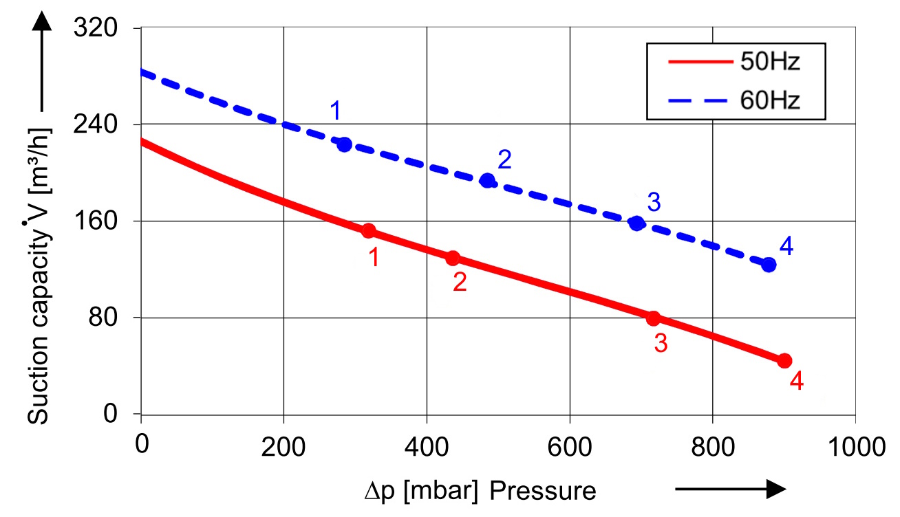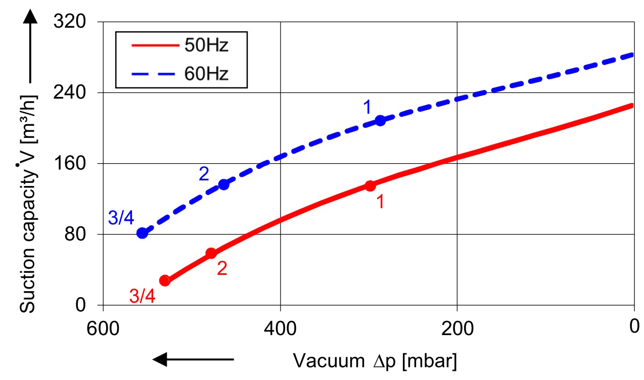 2 stufiger Hochdruck-Seitenkanalverdichter mit folgenden technischen Spezifikationen bei 50 Hz: