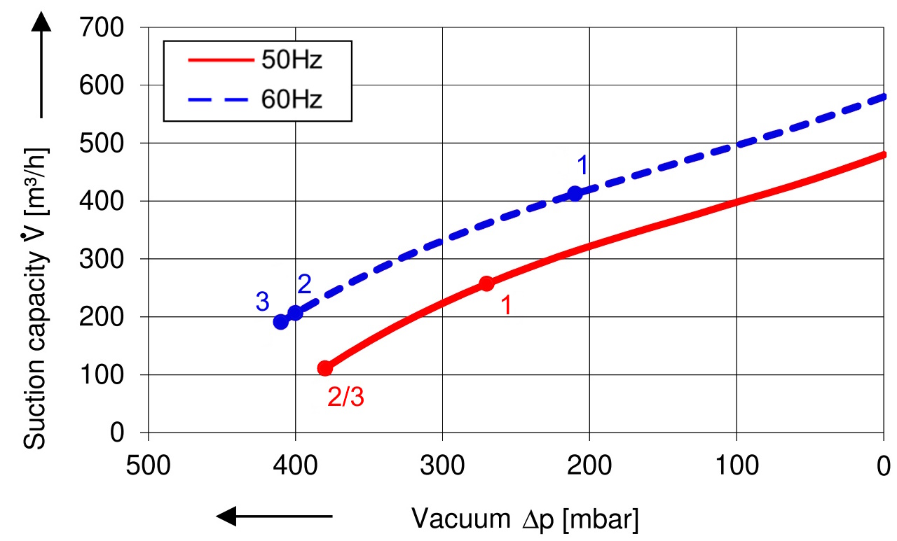 ⇒ keine Leistungssteigerung → möglicher maximaler Enddruck geringer als Nennlinie