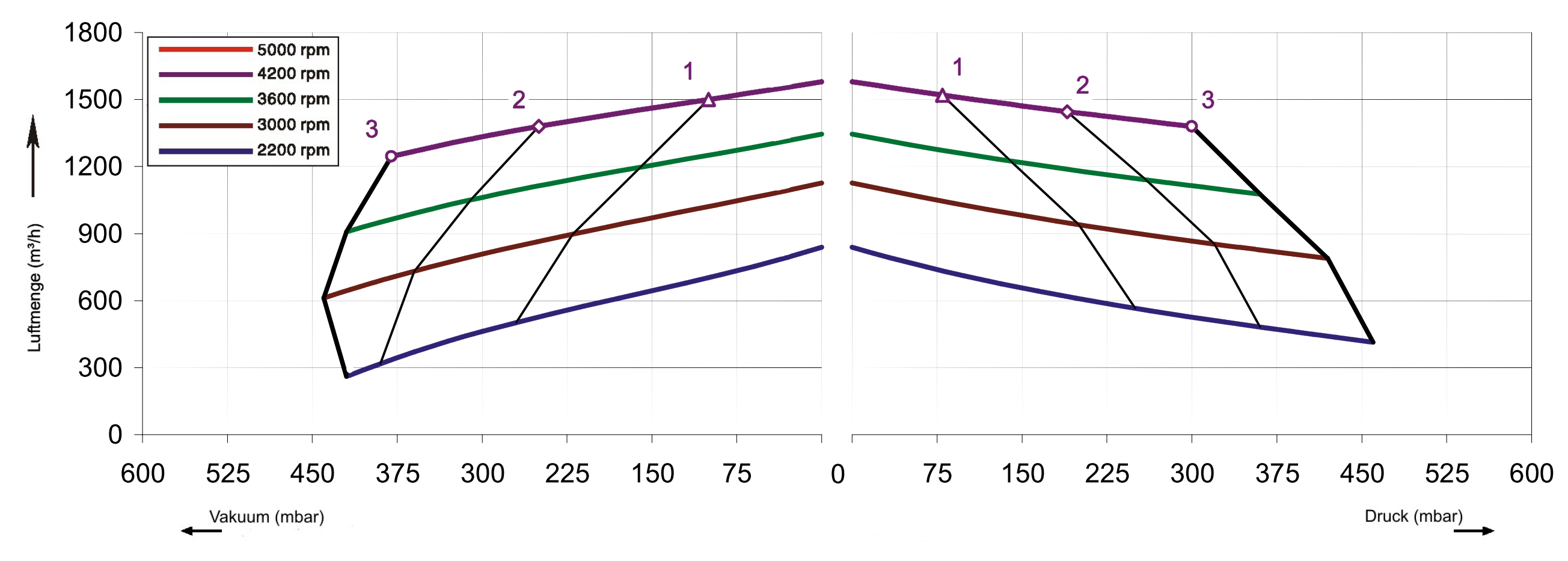 ⇒ keine Leistungssteigerung → möglicher maximaler Enddruck geringer als Nennlinie