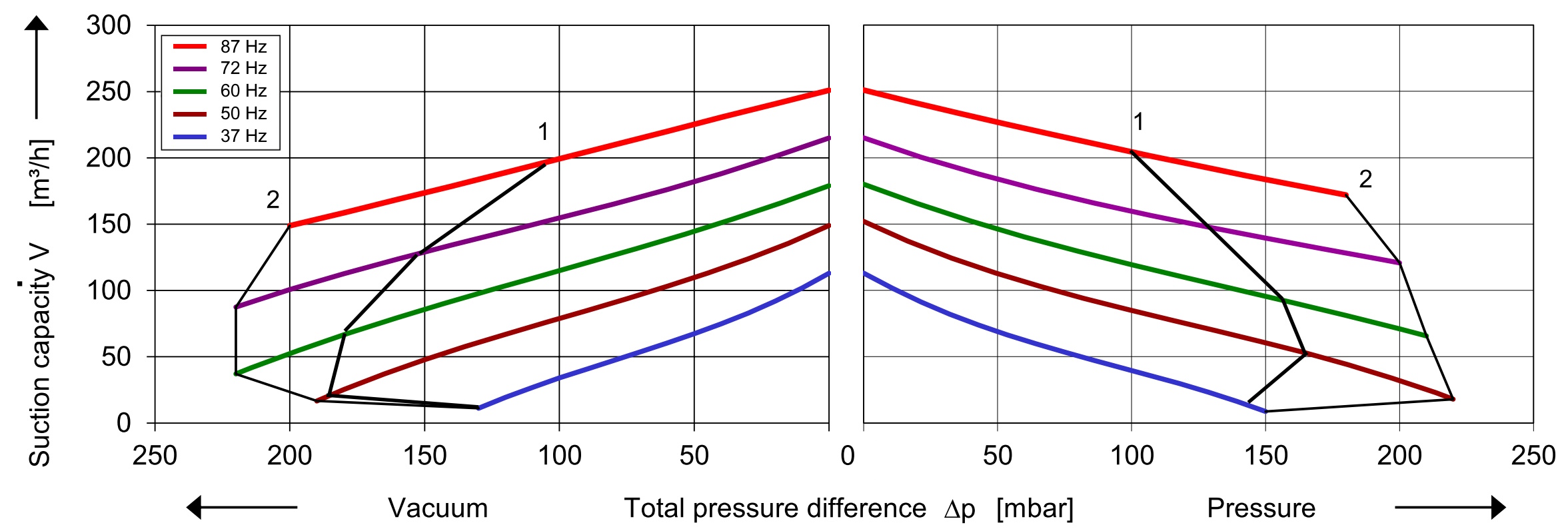 ⇒ Leistung steigt mit der Frequenz → möglicher maximaler Enddruck gemäß Nennlinie - Motoren mit der Endnummer 7 (400 VΔ / 690 VY) werden im Dreieck angeschlossen und können nur mit Leistungsverlust nach oben (> 50 Hz) geregelt werden