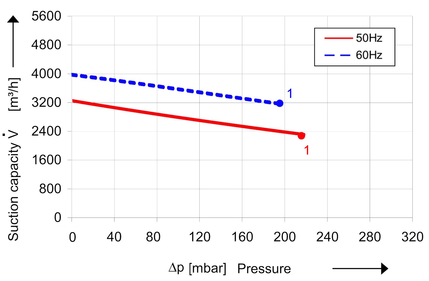 ⇒ keine Leistungssteigerung → möglicher maximaler Enddruck geringer als Nennlinie