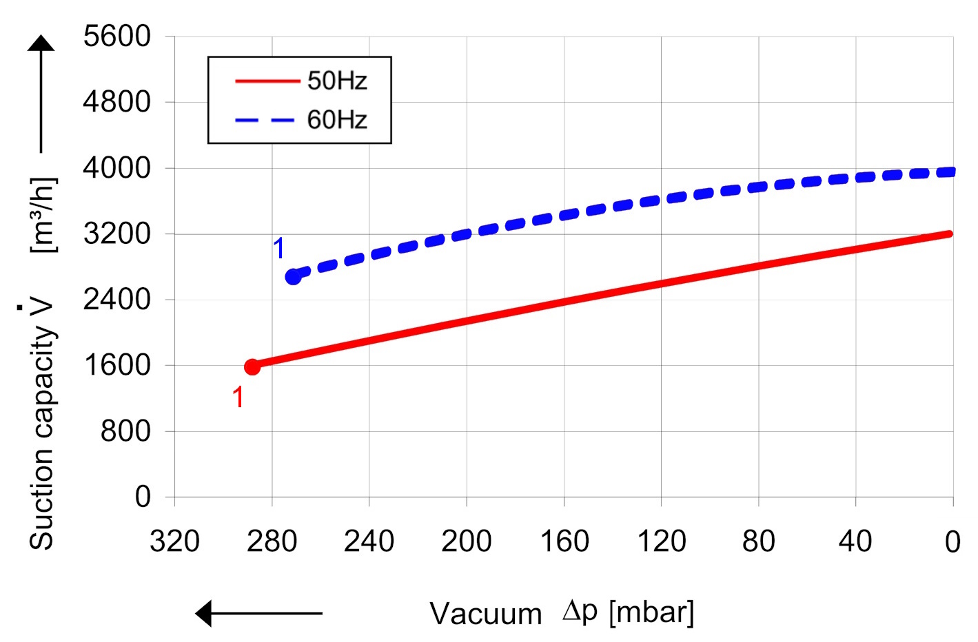 3 flutiger Seitenkanalverdichter mit folgenden technischen Spezifikationen bei 50 Hz: