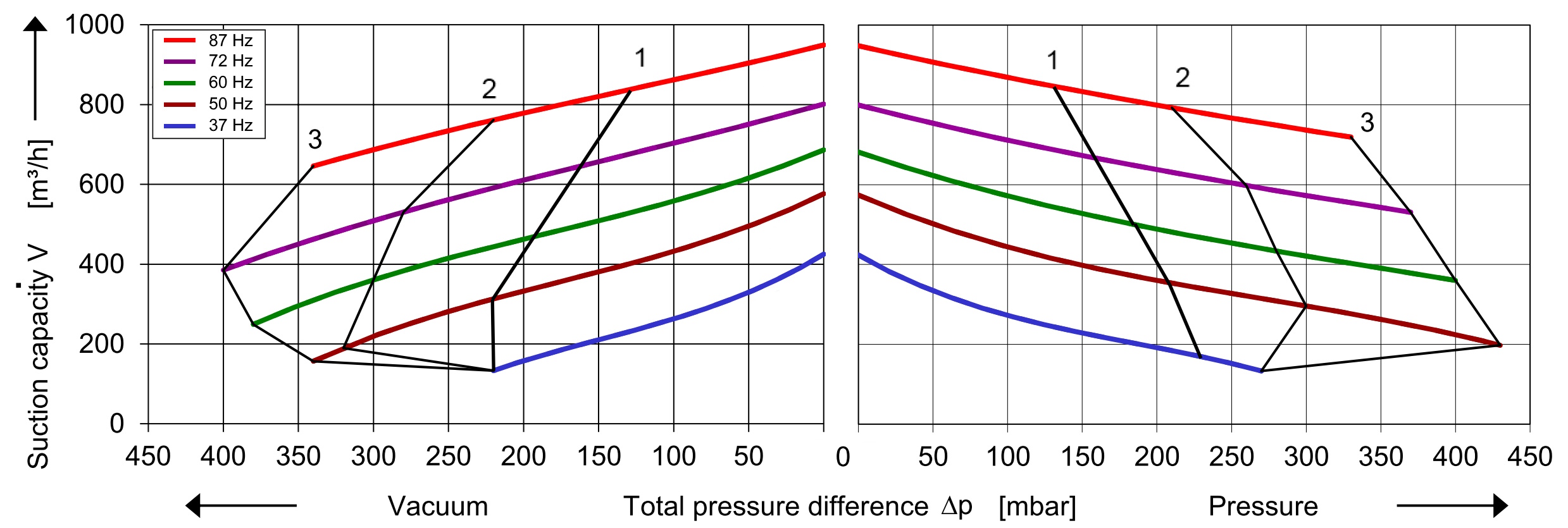 ⇒ keine Leistungssteigerung → möglicher maximaler Enddruck geringer als Nennlinie
