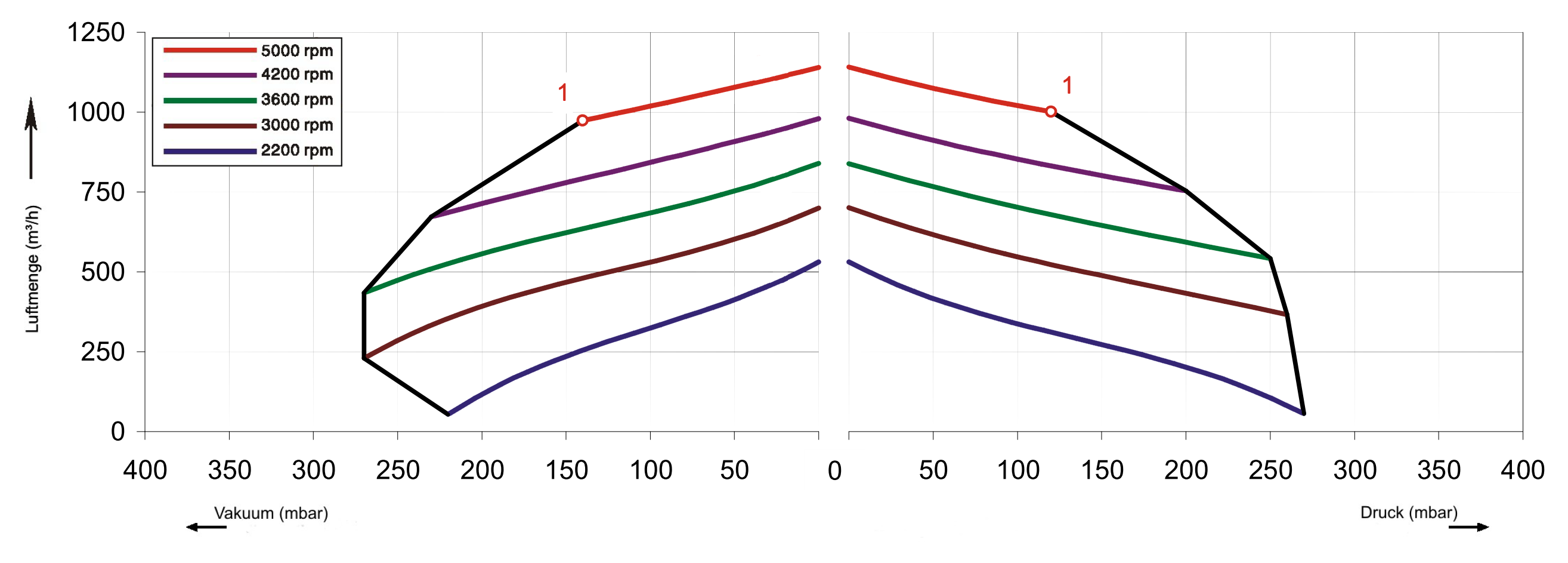 ⇒ keine Leistungssteigerung → möglicher maximaler Enddruck geringer als Nennlinie